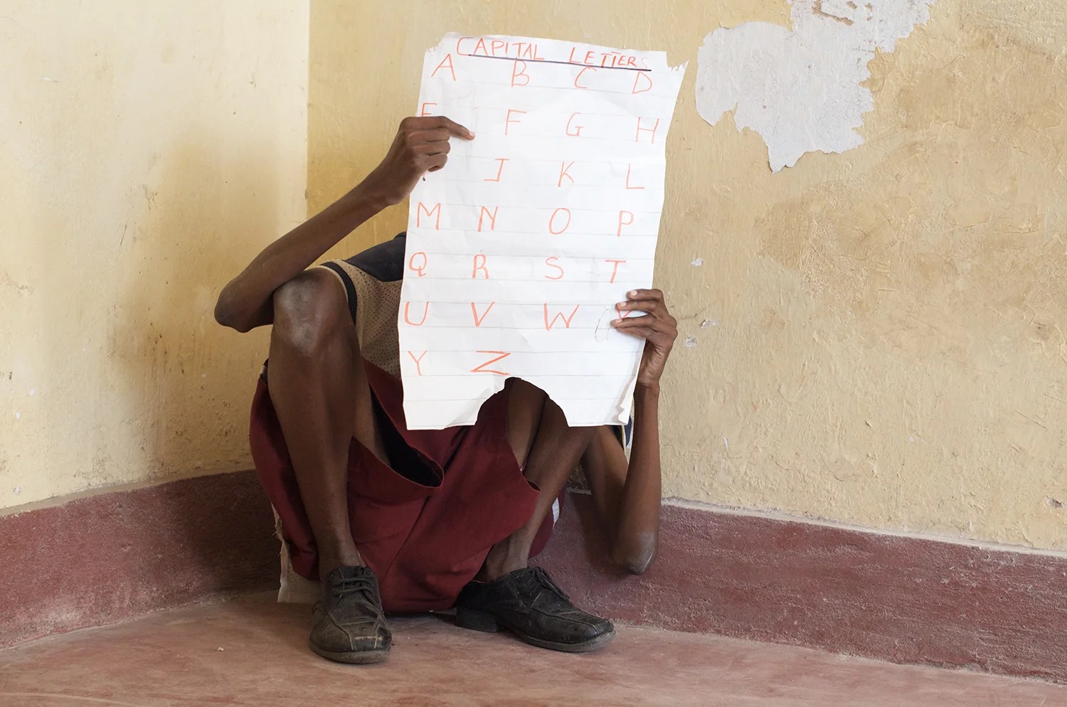 Absorbed by writing on the back of a teacher’s poster displaying the alphabet, this boy seemed unaware of what was going on in the small classroom. He remained utterly still for more than half an hour, while the other children participated in the lesson. The school in Mombasa, Kenya, had minimal space and doubled as a boarding facility.