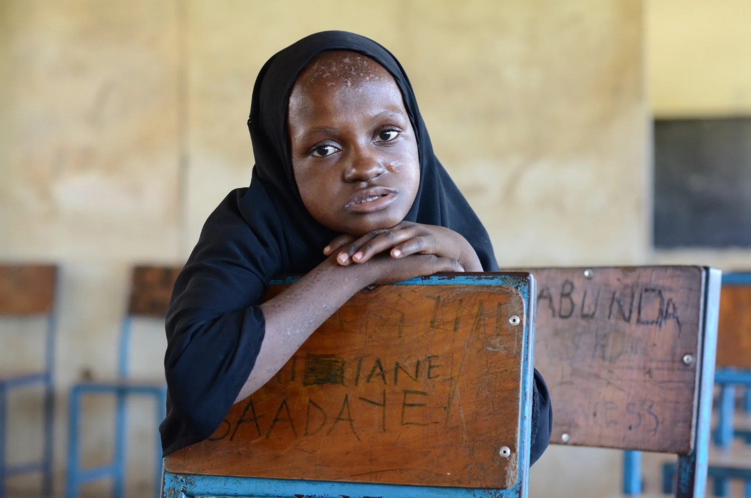 When her headscarf was pulled back we could see scars from the countless times this young girl has banged her head. The teacher at her school in Mombasa, Kenya told me that it was difficult to stop her when she became agitated. The girl engaged with the camera and enjoyed being photographed along with her classmates.