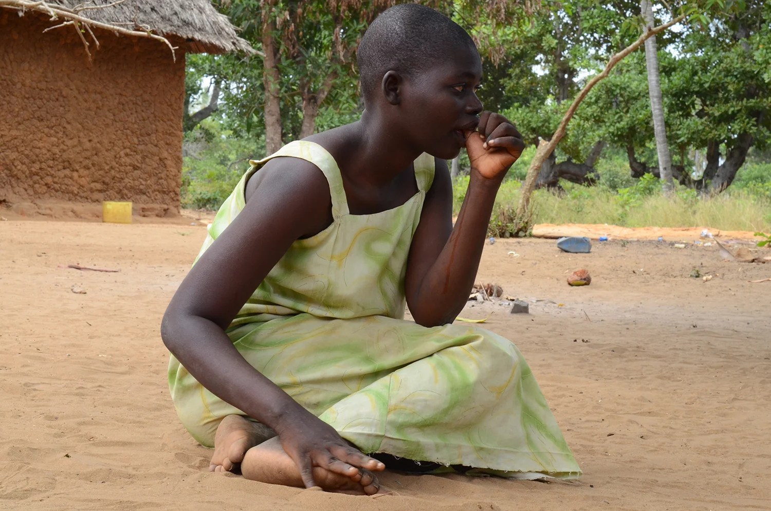 This adolescent girl lived with her mother and brother in a rural community south of Malindi, Kenya. She suffered from frequent seizures. I witnessed four in half an hour. The mother said that she refused to take her epilepsy medication but liked to eat sand, apparently as I was advised by a clinician a response to iron deficiency. When later she was assessed at the local district hospital a clinical officer prescribed another form of medication to control her epilepsy. She did not speak so much as gesture and utter sounds. She was a vital young woman, had a sense of humour, and an ability to recognise me on second meeting.
