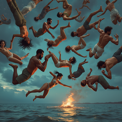 men, women, diverse ages, diverse skin tones, diverse body sizes, diverse body shapes, some men with beards, some men and women with long hair, all falling, some tumbling, some curled up, all eyes closed, all appear asleep, all falling from an expanse of dark sky toward an expanse of water, dim light from sky, reflections from fire on water, photo, PRDSLST