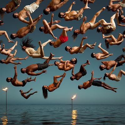 1. men, women, diverse ages, diverse skin tones, diverse body sizes, diverse body shapes, some men with beards, some men and women with long hair, all falling, some curled up, all eyes closed, all appear asleep, all falling from an expanse of dark sky, some nearing an expanse of water, some crashing onto water, dim light from sky, reflections from fire on water, photo, PRDSLST