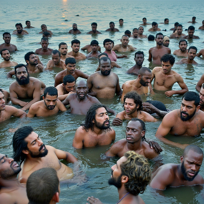 Men in a swimming pool, their bodies are visible underwater, while the surface above ripples with light reflections, partially distorting their heads.