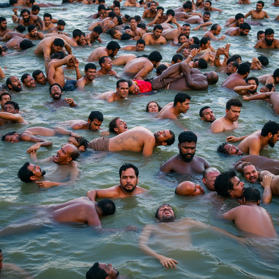 3. men, women, diverse ages, diverse skin tones, diverse body sizes, diverse body shapes, submerged in water, seen from below, seen from the shoulders down, some legs curled up, some legs dangling, some legs and arms outstretched, some fists clenched, light ripples through expanse of water, reflections from fire coming from above on water’s surface, photo, PRDSLST