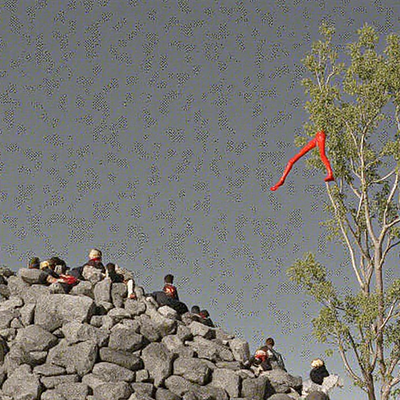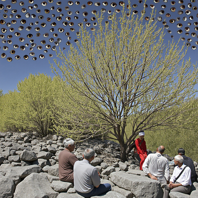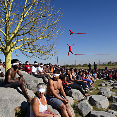 Blindfolded white young and old men. Blindfolded black young and old men. Blindfolded brown young and old men. Blindfolded yellow young and old men. Blindfolded white young and old women. Blindfolded black young and old women. Blindfolded brown young and old women. Blindfolded yellow young and old women. All blindfolded men and women sit on grey rocks facing a pale green tree without leaves to their right. No grass. No water. In the pale green tree without leaves is a bright red long thin half man half woman. In the dark blue sky above are rows of human eyes.