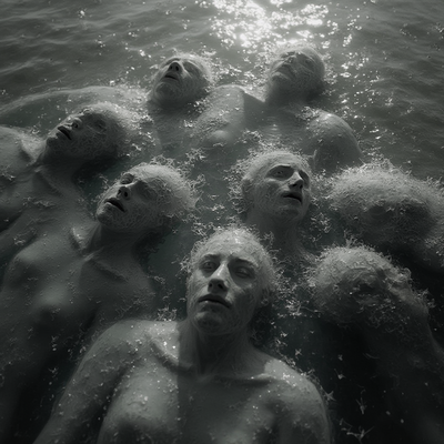 prdlst, Black-and-white high contrast photograph: closeup angle from above of monumental people made of cracking glass floating in water, some floating on backs, some curled up, no sky showing, stormy water, eyes and mouths closed, dramatic translucent lighting, austere, chaotic, highly detailed.