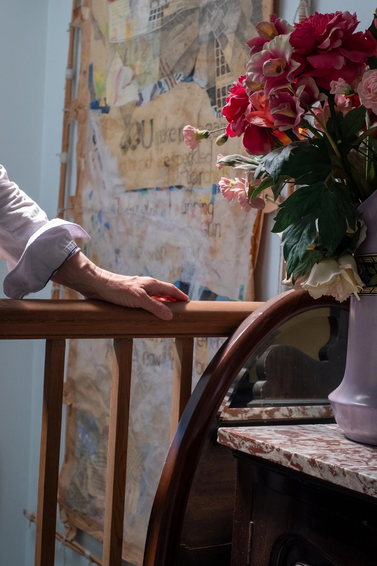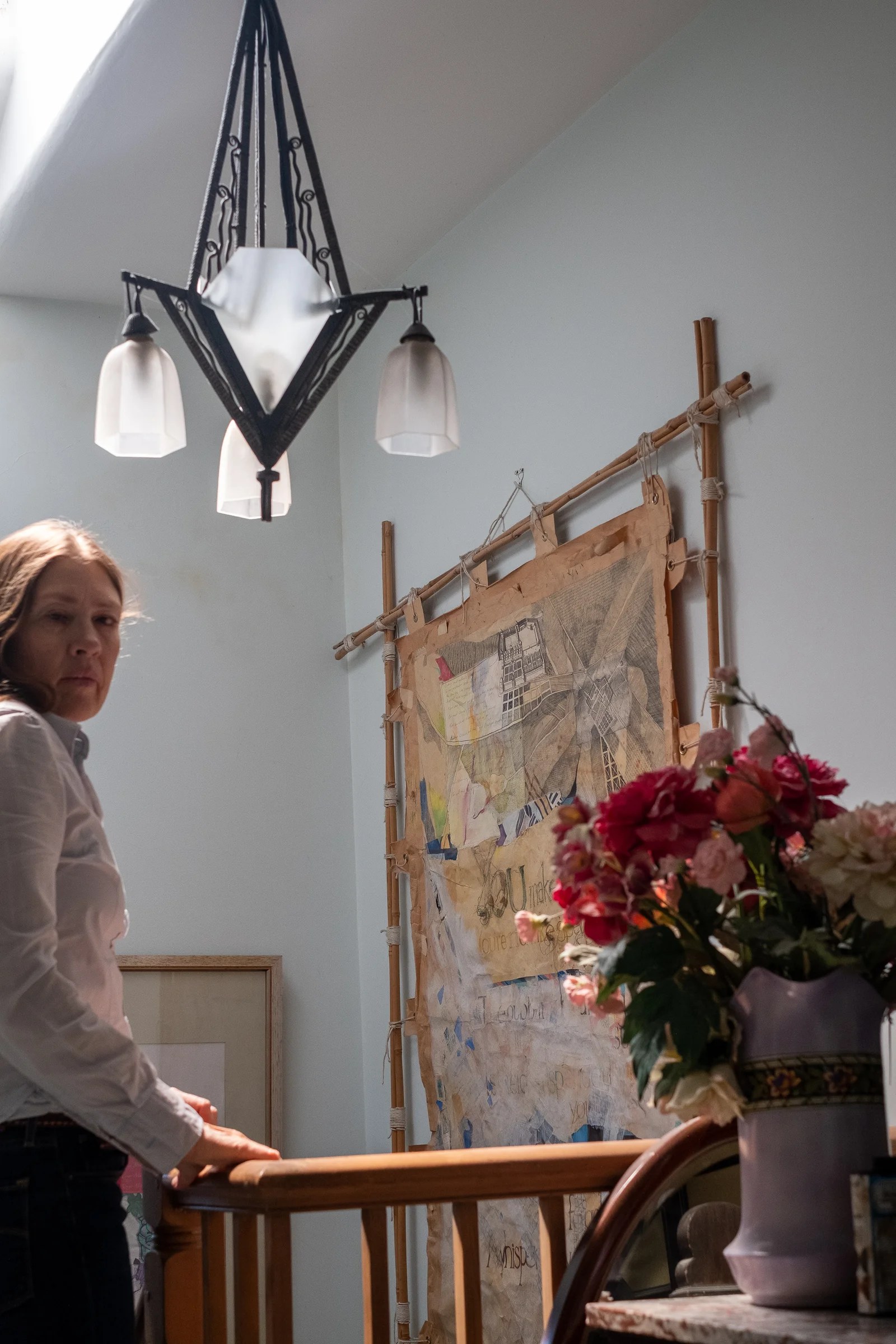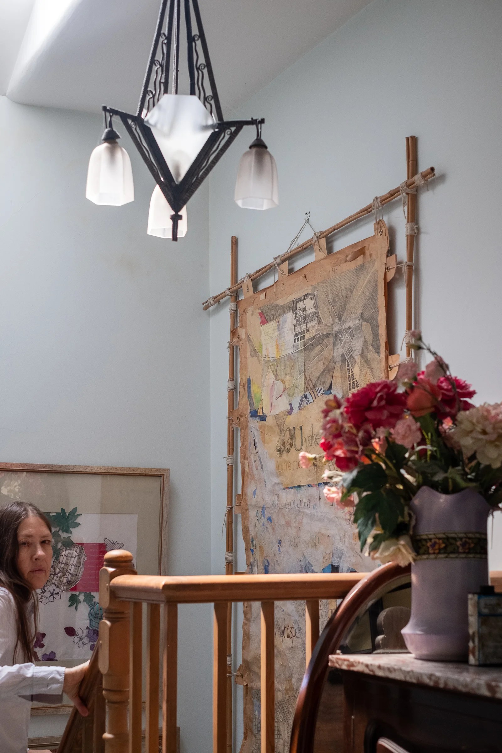 Reflections and details have their own presence. When I revisited the staircase and looked at the painting with the reflection of the art‑décor chandelier and the wall-hanging I felt the messages they contained spoke of remembrance to be better understood close‑up. Self‑Portrait, 2021