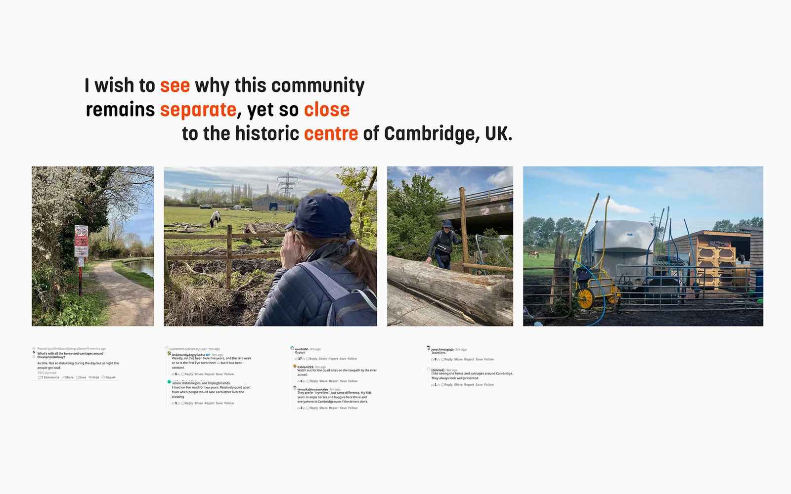 Mel set out to show me this part of Cambridge, giving me some insight into a community that keep themselves separate. I was having a chance to see what many are oblivious to when they use the towpath or row up and down the river. My intention is not to recreate what she told me, but to map out the affect this has on how I see my surroundings. I have approached the Fen Road community through their local support services, in the hope of sharing what I have put together, but no‑one has responded.